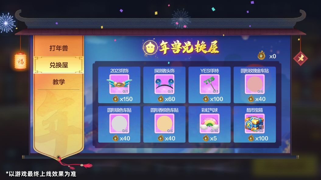 在对抗过程中年兽BOSS会掉落可以拾取的金币、酷币、宝箱,宝箱中开出的年币可以在兑换屋中兑换众多好礼,车友们不要错过哦~