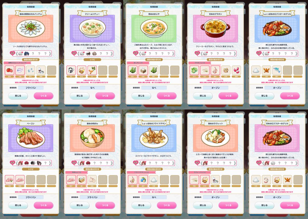 Tip2:对于非原味(图片背景色不是紫的)的菜品,菜谱并不是只如我所呈的图片们这样唯一的。对于这些菜品,【粉红色框】起来的区域中的食材是【不变】的。至于旁边的其他【没有框】起来的食材,贤者们【可以尝试】根据魔法使的口味【更换】为同一口味类别下的其他食材✓