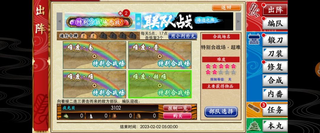 进入特别合战场仅消耗彩色贝壳,不消耗门票