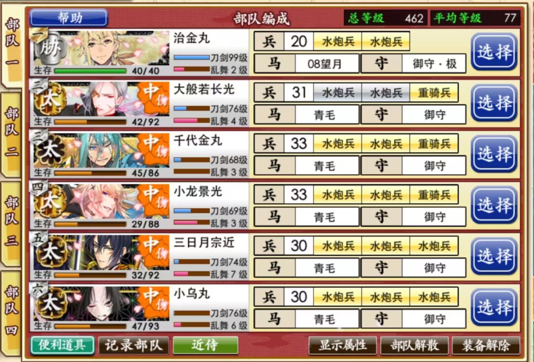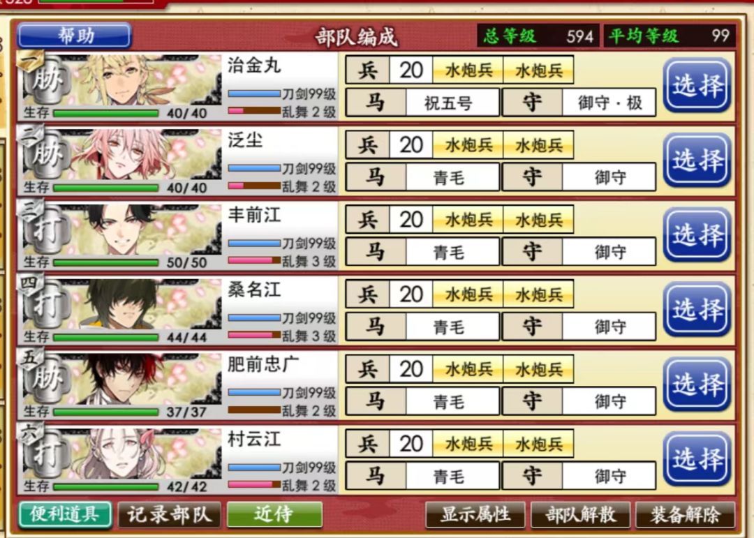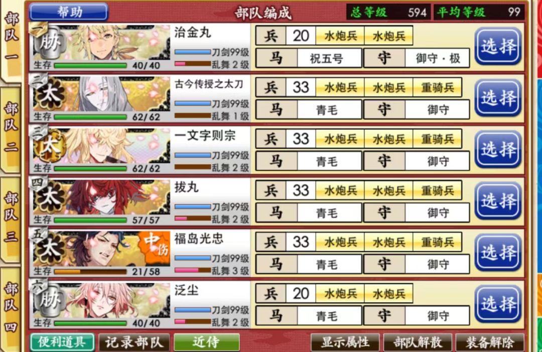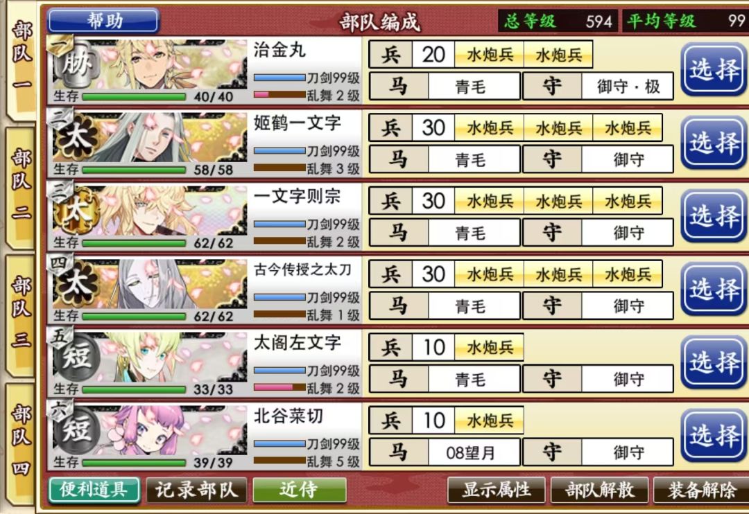治金丸放队长,七星剑带3水炮,其他都带2水炮不带远程,一队流,平均1.5局e4一局特别,基本上可以保证七星剑全程飘花