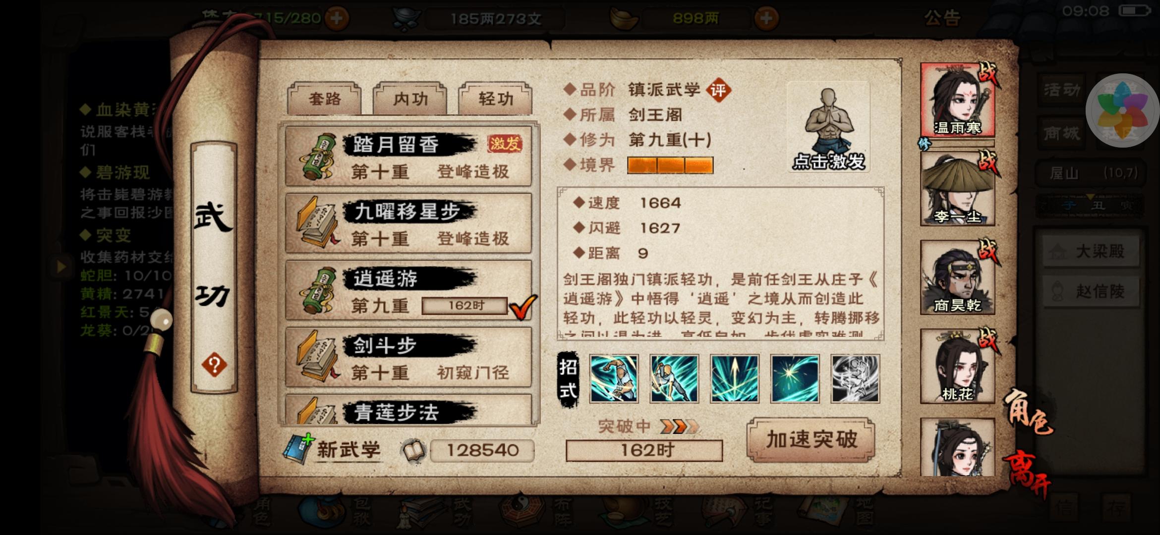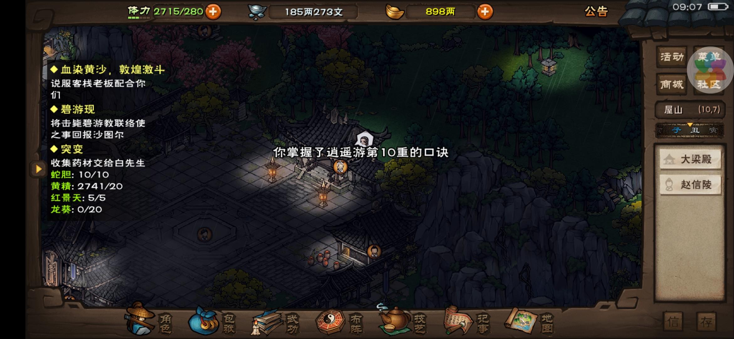 逍遥游九重了,再等一个星期就可以出师学邪剑了,还有一个问题我想拿荡魔枪,但是钱不够,所以我想问一问大家在没有月卡没有速刷的情况下,只有2000体力,如何最快的获得120两银子