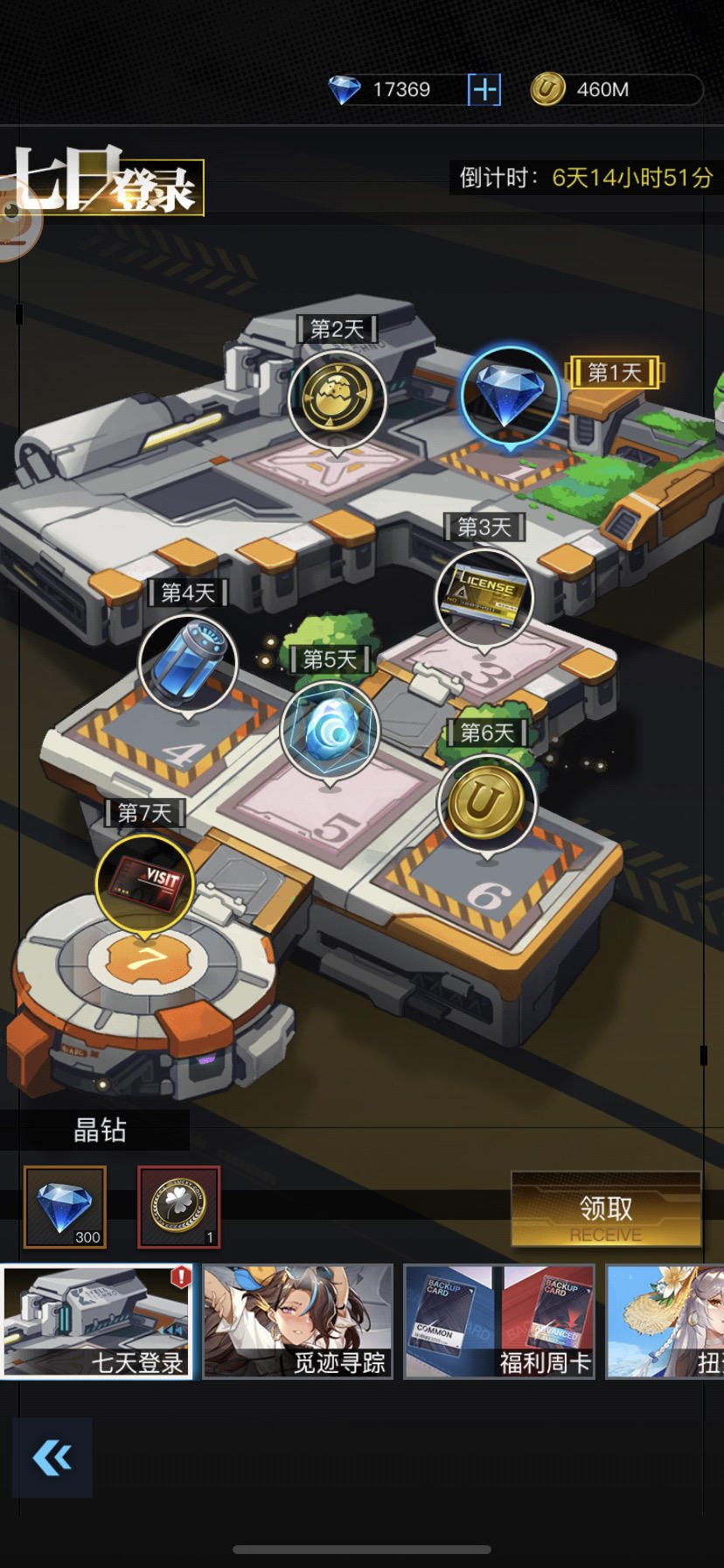 七天共可获得:300晶钻、3个高级扭蛋币、3张精英招募卡、2张定向招募卡、300重铸碎片、500k联盟币、500个能量栉、7个幸运硬币。