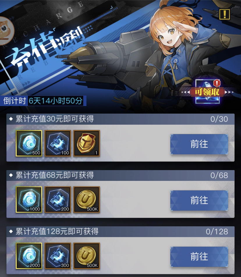 30元、68元、128元的大量重铸碎片、锚点乃至骑士币都是非常重要且稀缺的资源!性价比超级超级高!有氪金打算的小伙伴强烈推荐累充128!其余各档性价比都差点意思,大家按需选择规划即可。