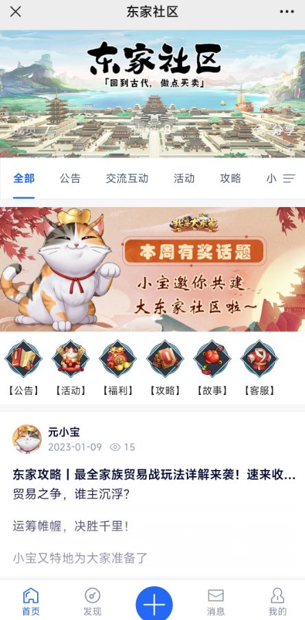 【东家社区】服务于咱们游戏的各位东家们,各位东家可以在上面发布自己对于游戏的一些看法、聊天八卦、讨论玩法相关攻略和游戏bug反馈,也可以在上面及时查看官方推出的一些公告及游戏动向。接下来小宝就来为各位东家详细介绍【东家社区】的使用方法及功能用途~