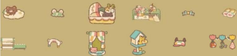 可爱派对—经常有小可爱来这里聚会、毛绒对对碰—可爱的东西当然要成双成对呀!毛茸茸长桌—等待菜品的时候要不要做点手工呢!春日餐具架—可爱实用好收纳、粉色回忆—粉色花朵承载着许多人青春的回忆、春日味道—春天吃起来是什么味道?是快乐的味道、园点小路—五颜六色毛茸茸的圆点走起来很舒适、小熊的美梦—让我们看看小熊在做着咋样的美梦、花香小食—小鹿捧着花朵糕点,一朵朵花朵在味蕾上绽放、可爱心事—原来每个人都有一颗少女心、小象洗手池—小象监督员提醒你,快来排队洗手、小鸭子集会—成群结队的小鸭子在泡着温泉,说着话,不过听不懂。