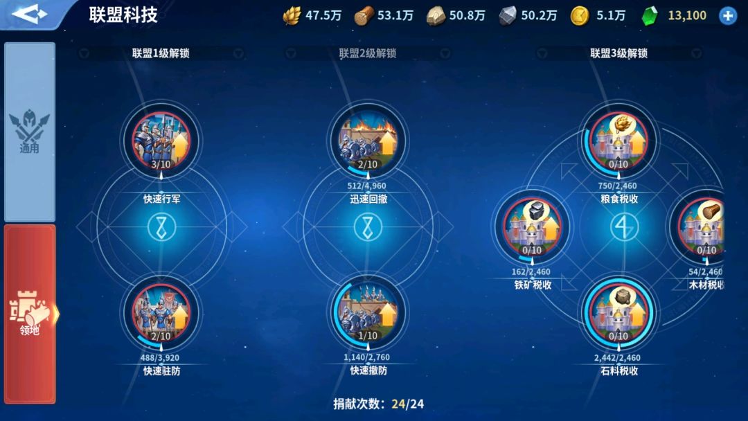 上一期我们讲解了联盟科技-通用中的相关技能,这一期我们来讲解联盟科技-领地的技能,能够大幅增加联盟在占领城市,行军等方面的优势。同样的,联盟成员可以使用元宝和资源对科技进行捐献,提升科技等级,每次捐献都能获得联盟贡献,联盟经验以及科研值。随着联盟等级的提升,联盟科技也将逐渐解锁。