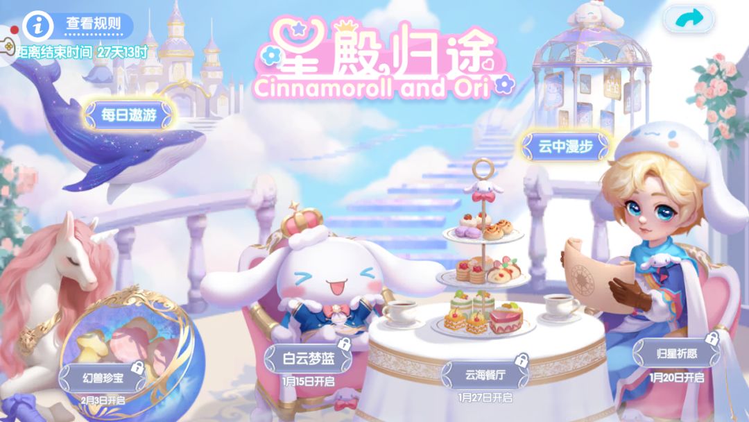 Cinnamoroll and Ori 星殿归途系列活动,将于1月13日正式启航。每日和Ori遨游,连续打卡,可以获得「星殿-绵云海海」部分家具及丰富的游戏奖励。
