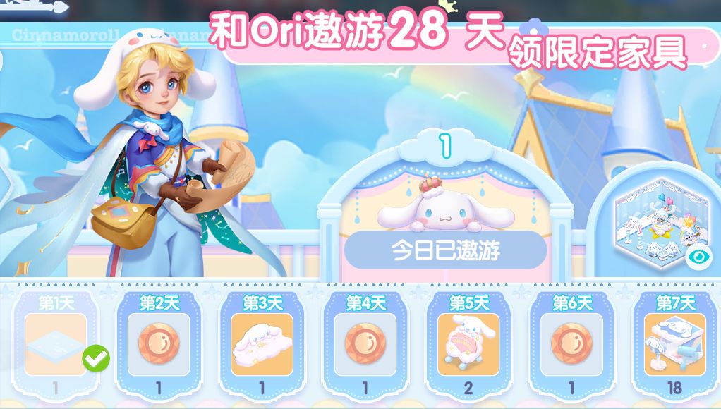 Cinnamoroll and Ori 星殿归途系列活动,每日和Ori遨游打卡,可以获得「星殿-绵云海海」部分家具及丰富的游戏奖励。