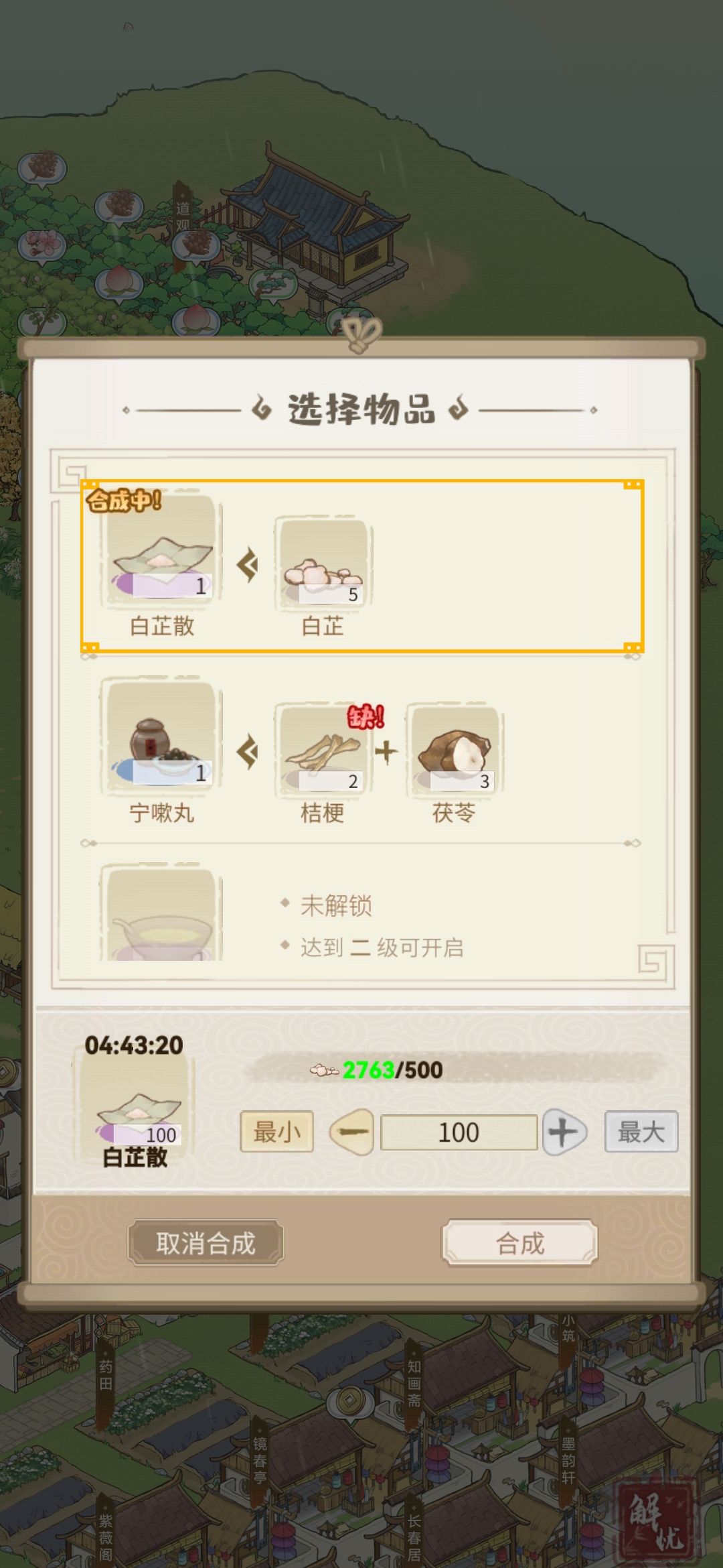处理方式一:10白芷+1级药铺+6分钟=2白芷散(1350)