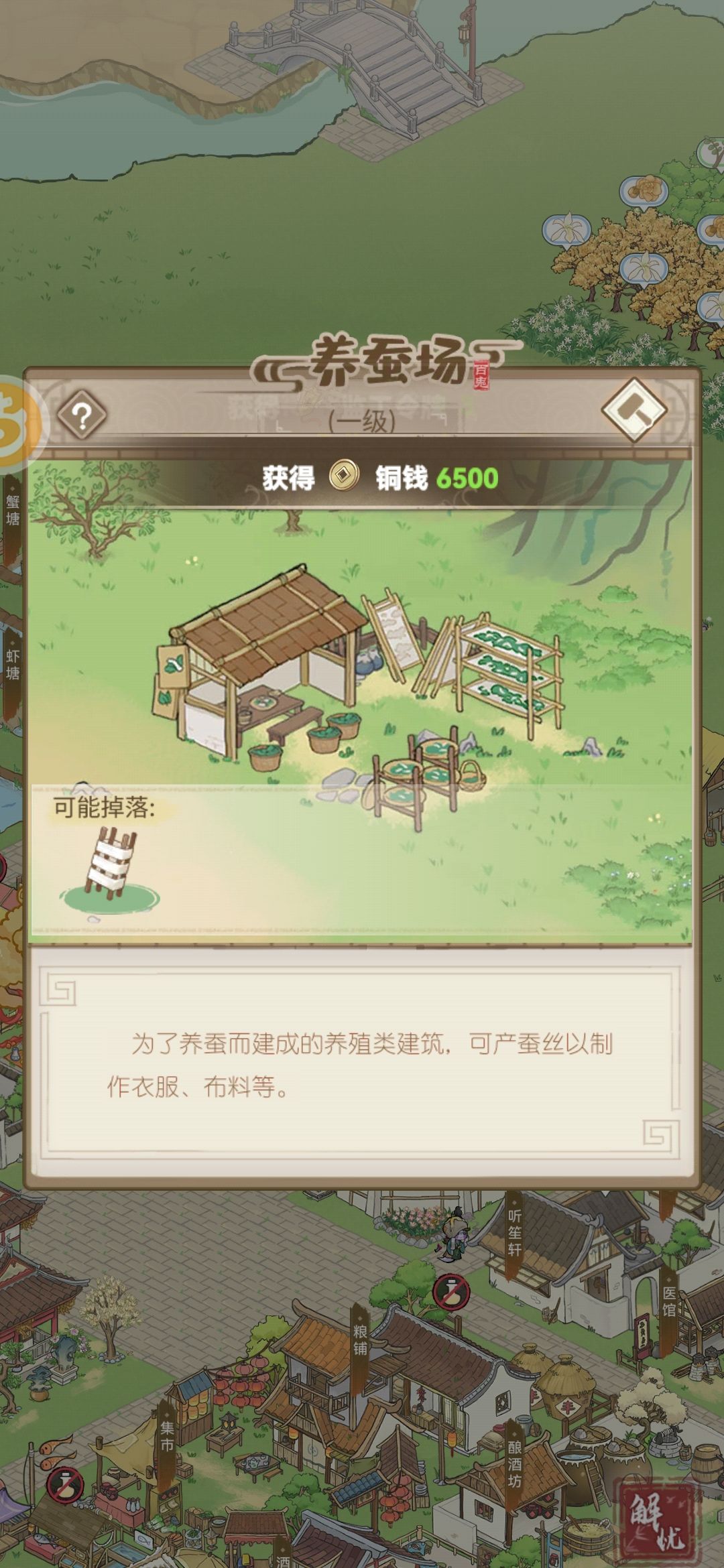 评价:千万别造,造了这玩意要造布坊(4.8w),布坊造完造裁缝坊(6w),然后还要等商行任务,关键是产出量还低(平均1小时4丝)造了就亏钱