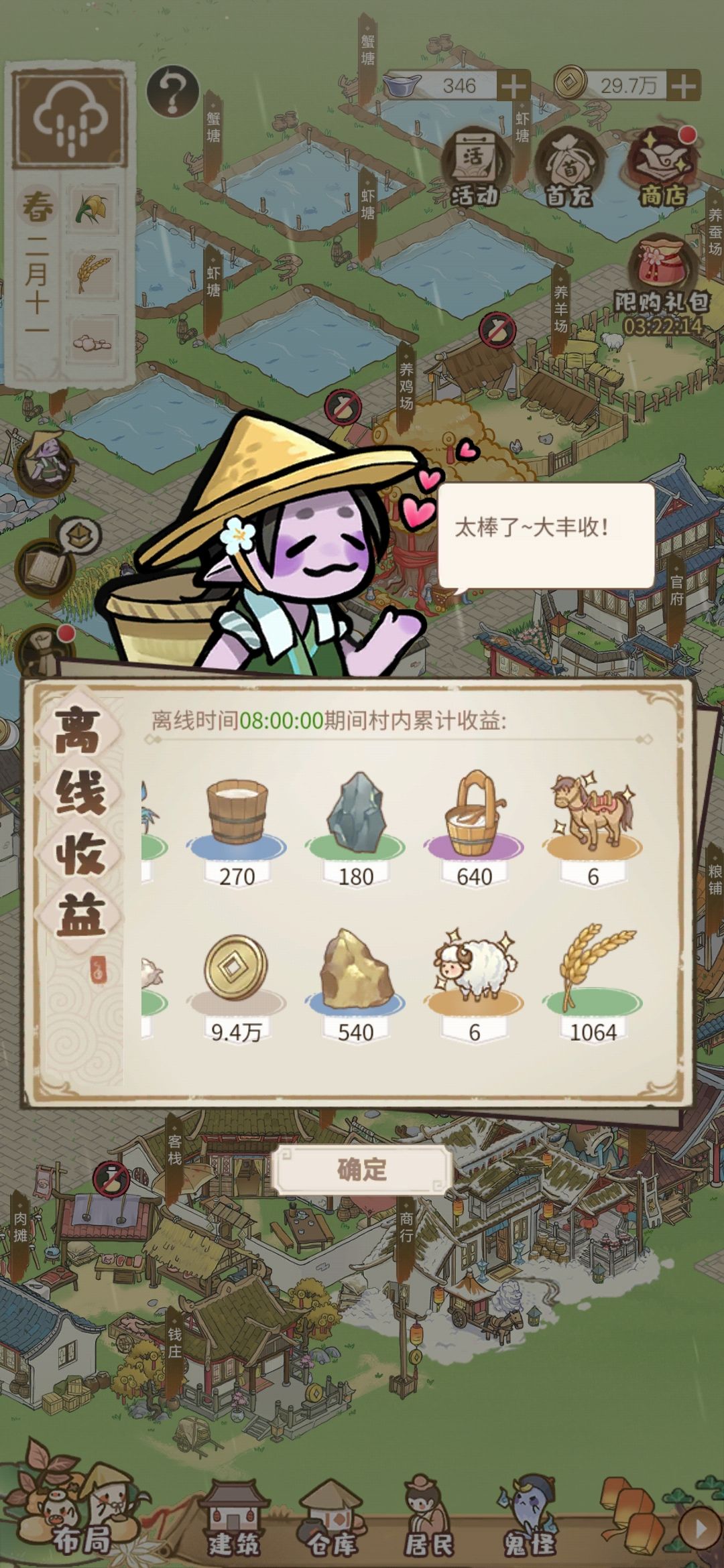这件事专门拎出来说一下,升级耗钱太多了,不要有钱就升级,后面升不动的,先把赚钱的建筑搞了再说,哪怕是陆产养殖的优先级都比拉等级高。