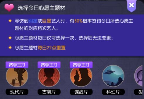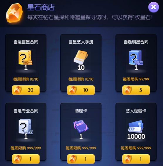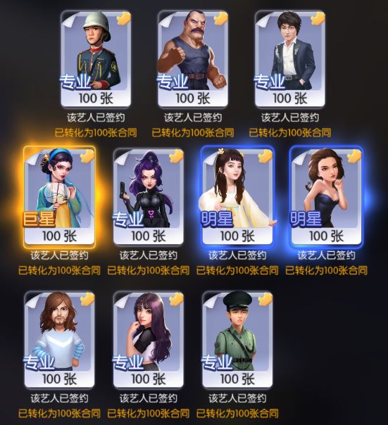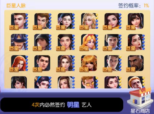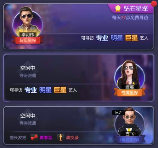 寻访说明:每使用1张钻石星探卡可以进行1次寻访,寻访后可随机签约改星探人脉中的所有艺人;如果该艺人已签约,则会转化为该艺人的1组合同(100个),合同可用于升级该艺人技能或助理位解锁