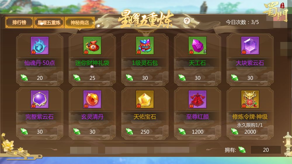 章节通关后可以获得大量道具以及星曜翠石,用于在神秘商店兑换宝石、永久时装至尊红颜以及用于晋升境界等级的修炼令牌·神级。
