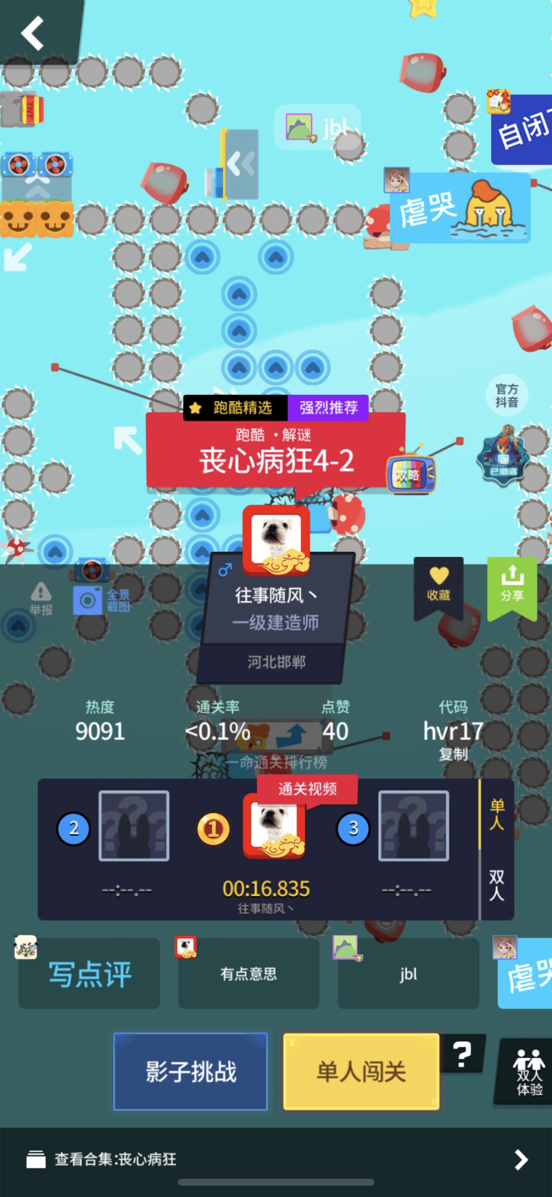 《丧心病狂4-2》代码hvr17,目前热度9091,仅祖师爷本人通关,难度<0.1%