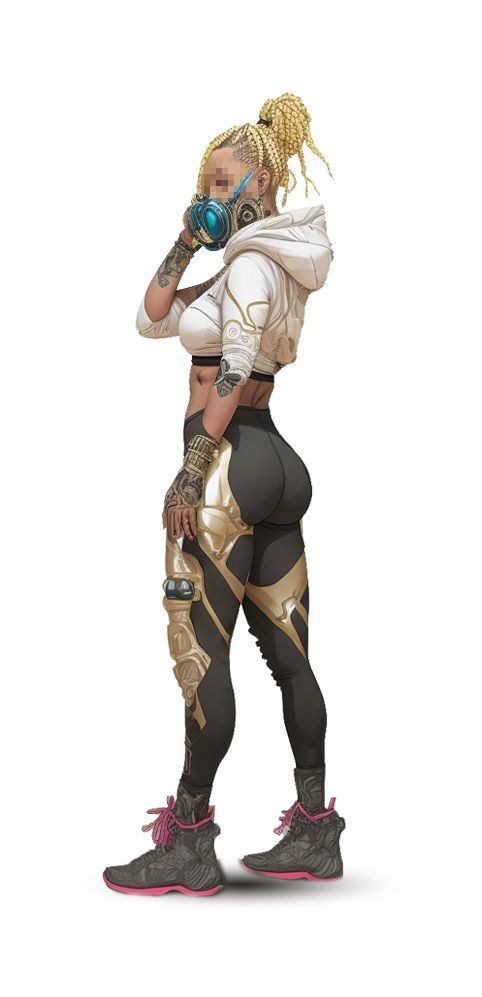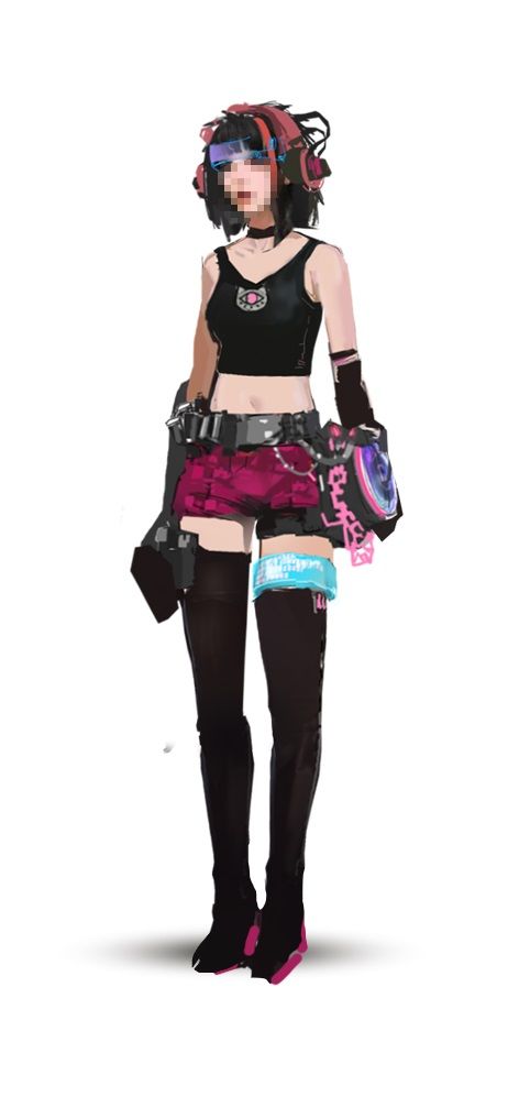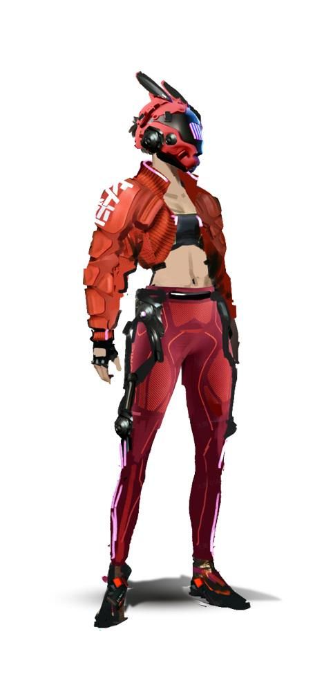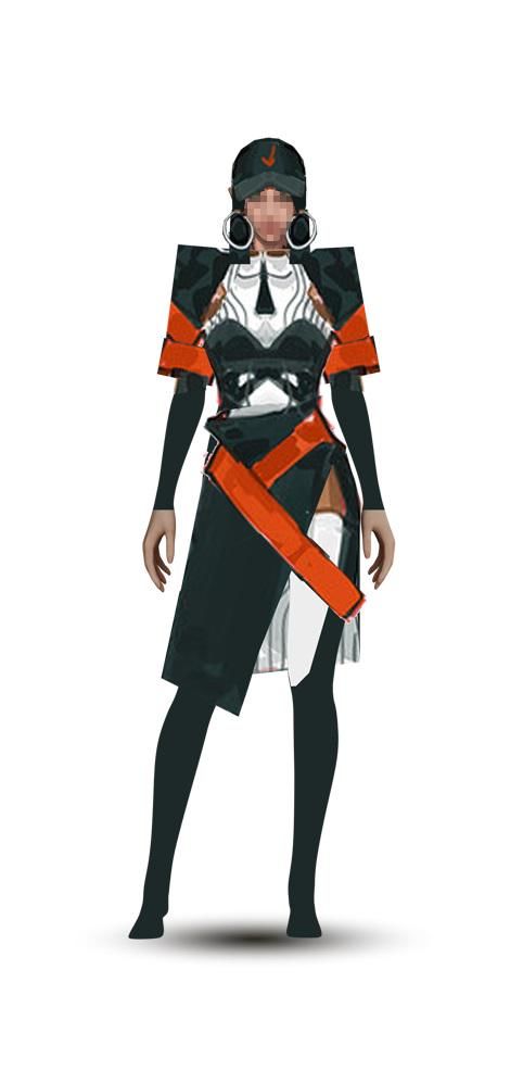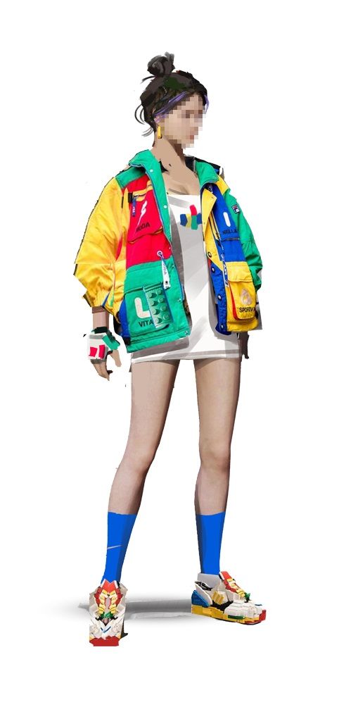 机能风是由CYBERPUNK (赛博朋克)延伸而来。 这种风格的服装一般较为宽松,大口袋、绑带、口罩和帽子是机能风服饰常见的元素,配色上黑色出现的频率比较高。我们在此基础上做了细节调整,将口罩和帽子改为更具有未来感的机械头盔,将绑带和大口袋改为依附于服装表面的机械外骨骼,颜色也会使用更加鲜艳的亮色。