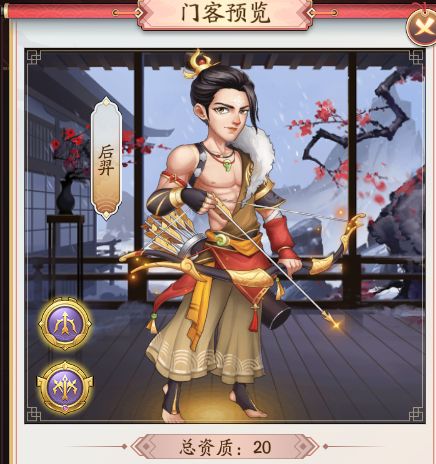 门客资质今天我们来介后羿这个门客,后羿这个门客肯定都听过他的故事后羿射日的故事,他是属于我欲成仙系列的门客。他的初始总资质是20。接下来我们就一起来看看有那些属性吧。