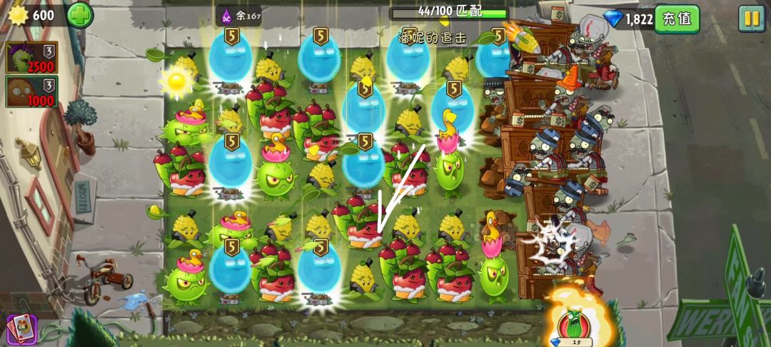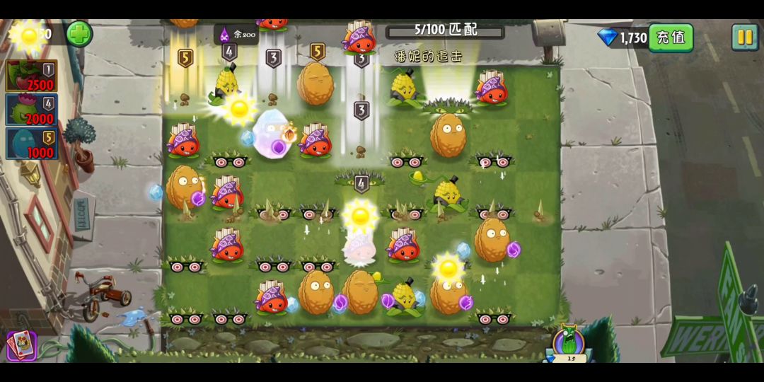 消消乐有运气成分,以一边消一边暂停观察,前面的防御植物最好不要消,集中消后面