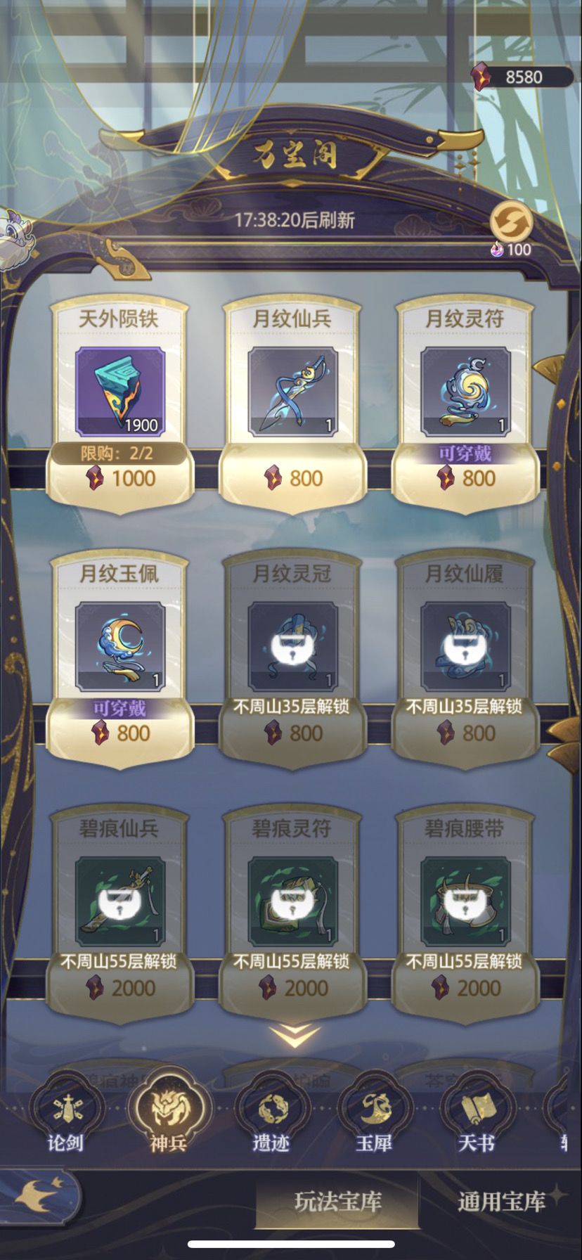 不周山前期 能爬多少爬多少,神兵只有两个途径一个氪金一个万宝阁购买。神兵购买币和突破材料来自不周山,因为前期的神兵很便宜所以大家可能会发现剩了好多,每次就全拿去买天外陨铁,在不周山推到6,7十层的时候开始囤或者一开始就 囤后面的装备很贵很贵!!!