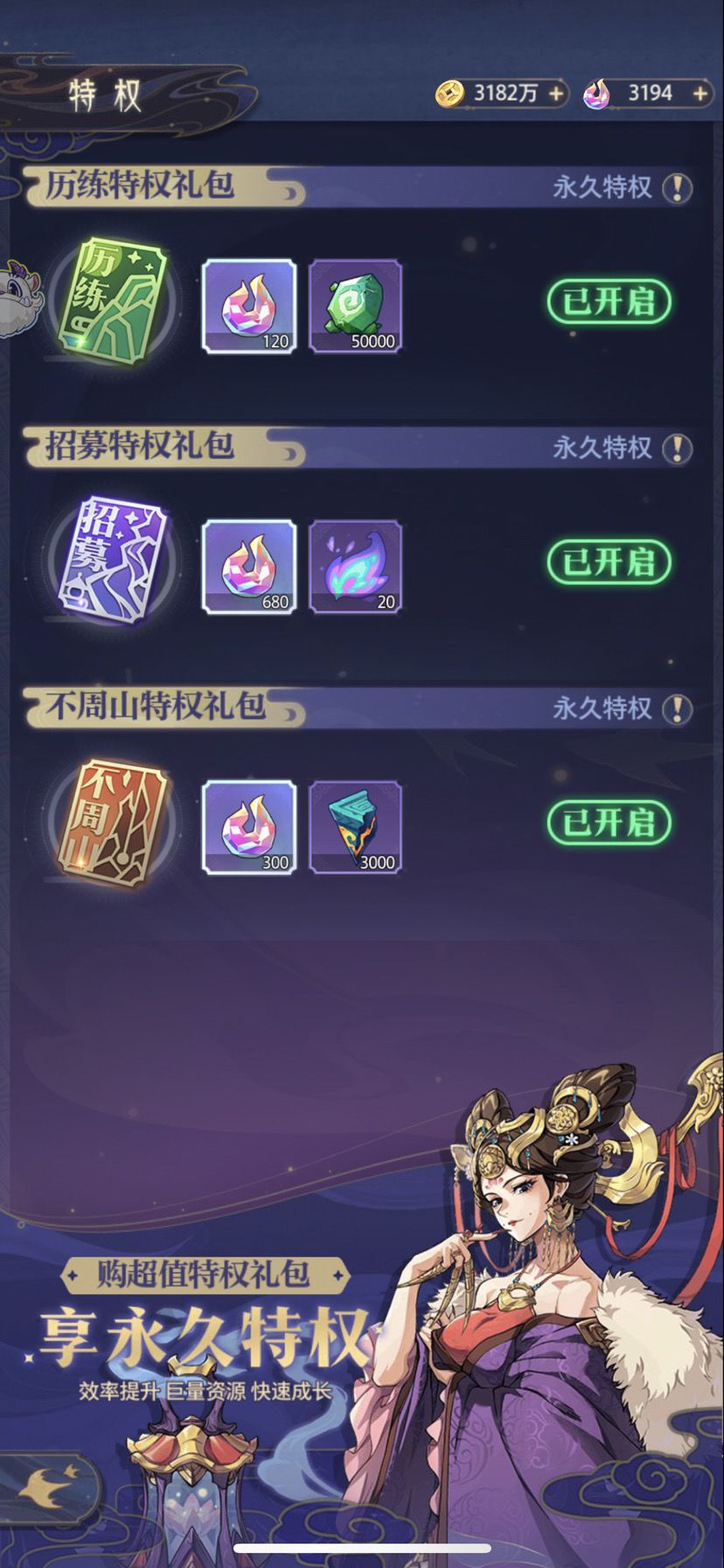 三个特权全买,特别是第一个历练特权直接决定了你前期的强度, 历练特权一定要第一天就购买