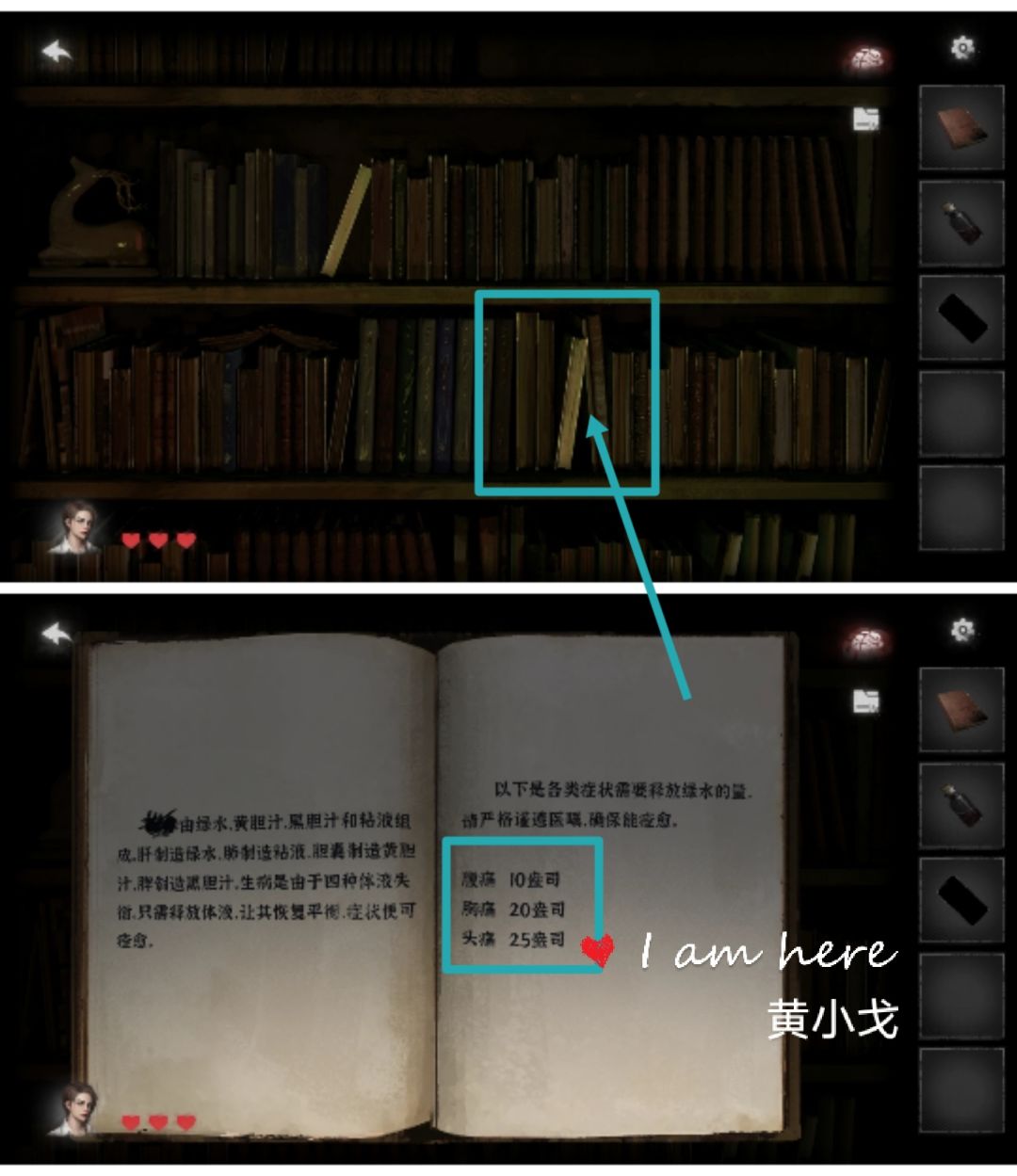 3.查看下方书籍,获得线索(腹痛10、胸痛20、头痛25)