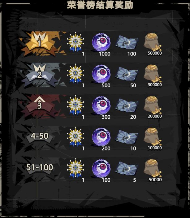 届时,将会为荣誉榜上榜玩家发放结算奖励,奖励内容如下所示: