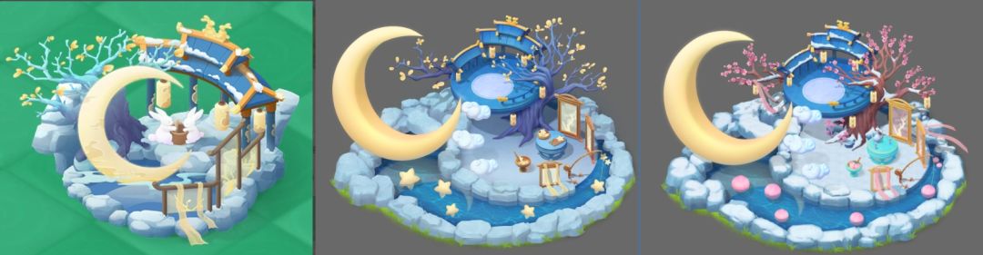 宠物窝的设计是以嫦娥的广寒宫为设计理念的,设计初期恰好瞄到了隔壁《传说中的合合岛》游戏里的广寒宫,于是一拍即合,激情联动,在他们广寒宫的基础上设计成雪心兔的豪华宫殿。