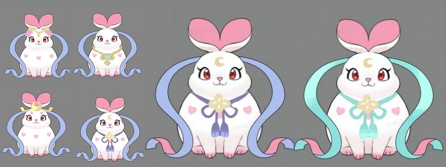 为了迎合新年天宫主题皮肤,美术为雪心兔设计了一身仙女造型,带装饰版的兔子出了4版草图,飘带的颜色也经过了项目组内部激烈的讨论与投票,才有了大家在游戏里看到的最终形态。