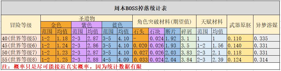 而在周本的掉落概率上,世界等级5时稳定掉一个,世界等级6掉1-2个,世界等级7掉2-3个。