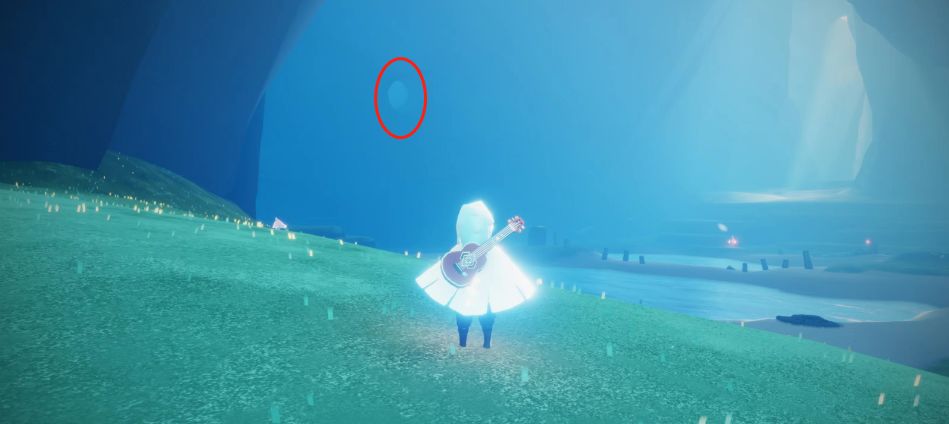 接下来我们前往雨林大厅。到达之后我们往静谧庭院飞,在飞过去的途中我们视角看向地图的右边,然后时刻注意下面。当我们看到一颗大树的时候就能在下面看到一个地道一样的口子,下去进入隐藏图大树屋。进入之后我们往前走,走到森林里面,然后往右上面看,能看到有树有个缺口(如下图红圈),然后往那里飞,飞到就能看到里面有一个光之翼了。这里面的挺不好拿的,尤其是体力比较少的小伙伴,不仅要面临淋雨带来的体力消耗,还要面临长按飞行时的体力消耗。