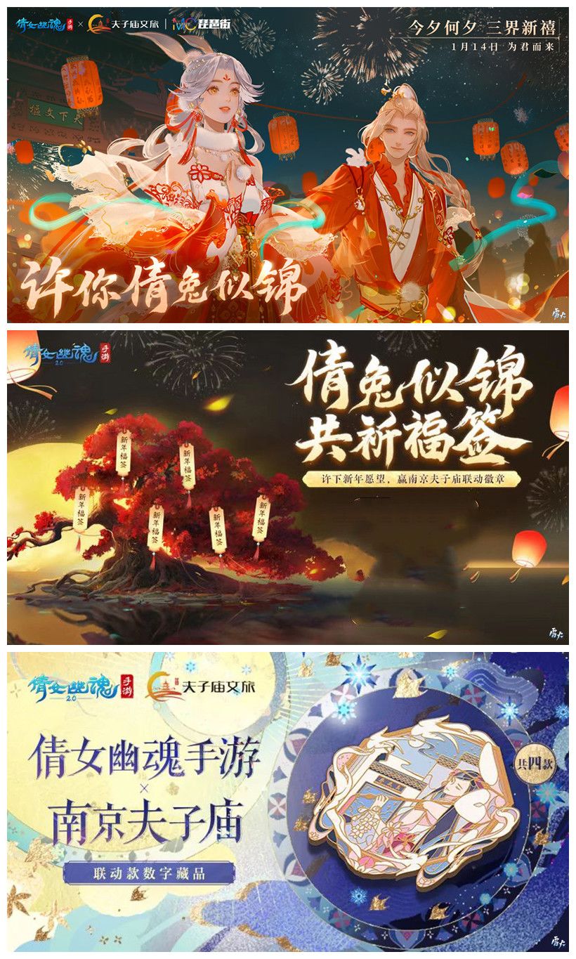 倩女手游x【夫子庙文旅】携手贺岁,【倩兔似锦】新年祈愿福签玩法开启,线上祈福好运翻倍,玩家分享专属福签更有机会赢取实物周边!1月14日-2月14日,期待与你相约秦淮河畔,共赏国风新春灯会!梦幻倩女主题灯组、绝美coser等你线下打卡。更有珍稀数字藏品【金陵倩影】1月9日-2月28日限量发售!四款限量周边待君收入囊中~