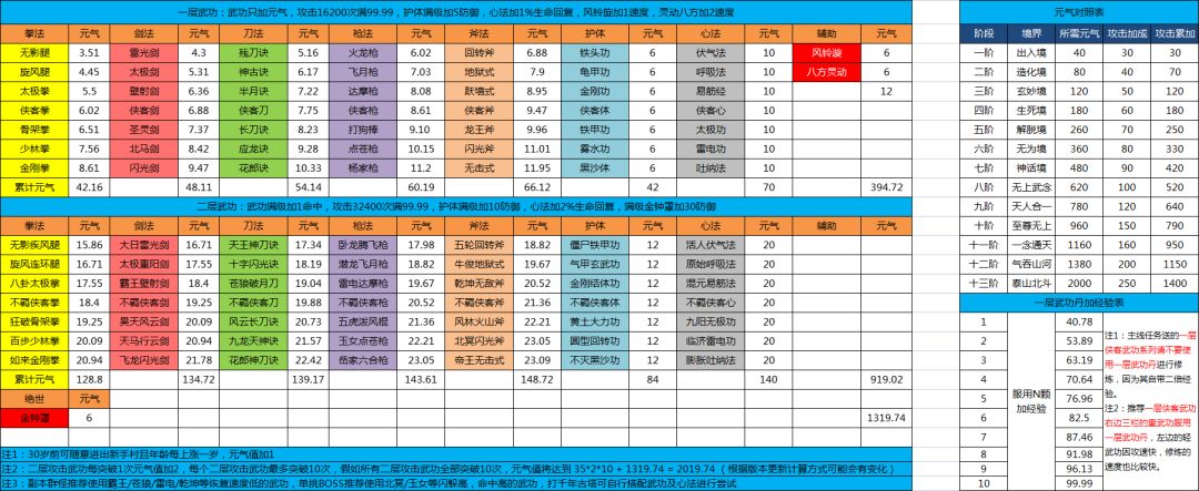 师弟师妹们请认清本游戏的核心,练武功,练心法,练挨打(护体),副本打装备!每门武功满级后提供元气,元气达到一定数值提升境界(境界提升攻击),新人需要注意的就是尽快达到80元气升造化境可以练习二层武功,下图为各种武功满级后所加的元气、提升境界所需元气及境界所附加的攻击力。![[嗒啦啦4_好耶]](https://img-tc.tapimg.com/market/images/d378b7a8f38cae2d3dfb6170d918238b.gif)
