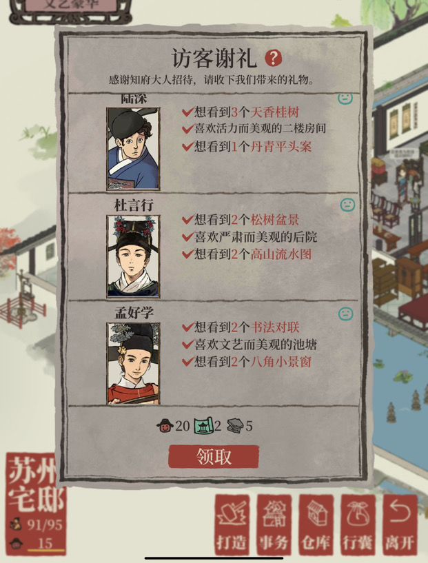 四个人都完美接待了,但是奖励好少,接待之前显示湖泥和石料都会有的