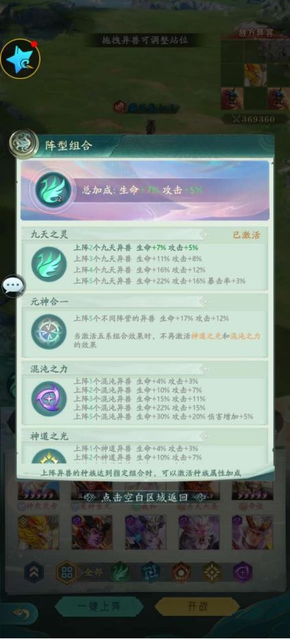 异兽前期有九天、四海、八荒、神道、混沌5个种族,不同种族的组合对阵容的加成会产生影响,元灵在选择异兽的时候可以考虑种族的搭配效果