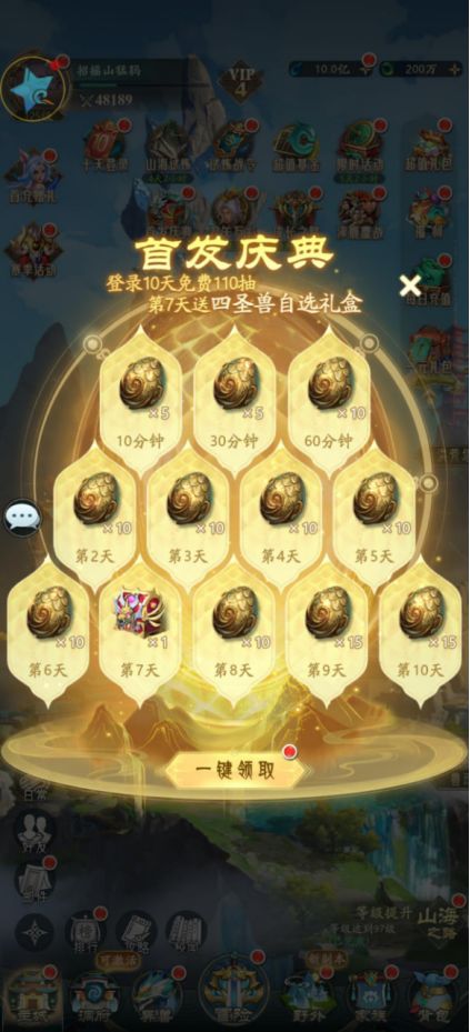 首选十天登录,连续十天登录可以获得祝融异兽,还有玲珑塔神器领取,作为度过前期的异兽和神器,是再适合不过的了。