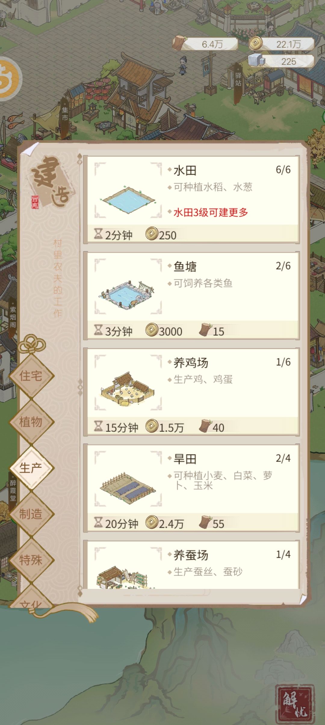 俗话说要想富先种树,要挣钱必种田。这边建议开局一级水田拉满!后面看铜钱先后加鱼塘,养鸡场,记住每种只要一个!已经足够了!!(鱼塘是我鱼塘升了二级后才又买了一个)