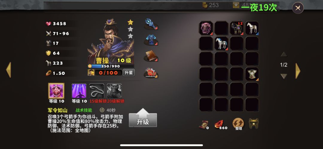 由于没有购买其他英雄,首次打这关只能使用免费英雄曹操、夏侯惇,防御塔选择剧毒塔、狙击塔,战术卡使用破敌、乱敌、箭塔精通、剧毒新星、修罗堡垒,曹操、夏侯惇装备如图所示
