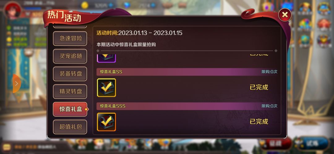 首先进游戏根据新手指引操作,但是给的一些新手奖励别乱用,尤其是钻石、装备转盘币、精灵转盘币、特级坚果、高级坚果这些。用补偿或者攒起来的钻石把惊喜礼盒全部买光。