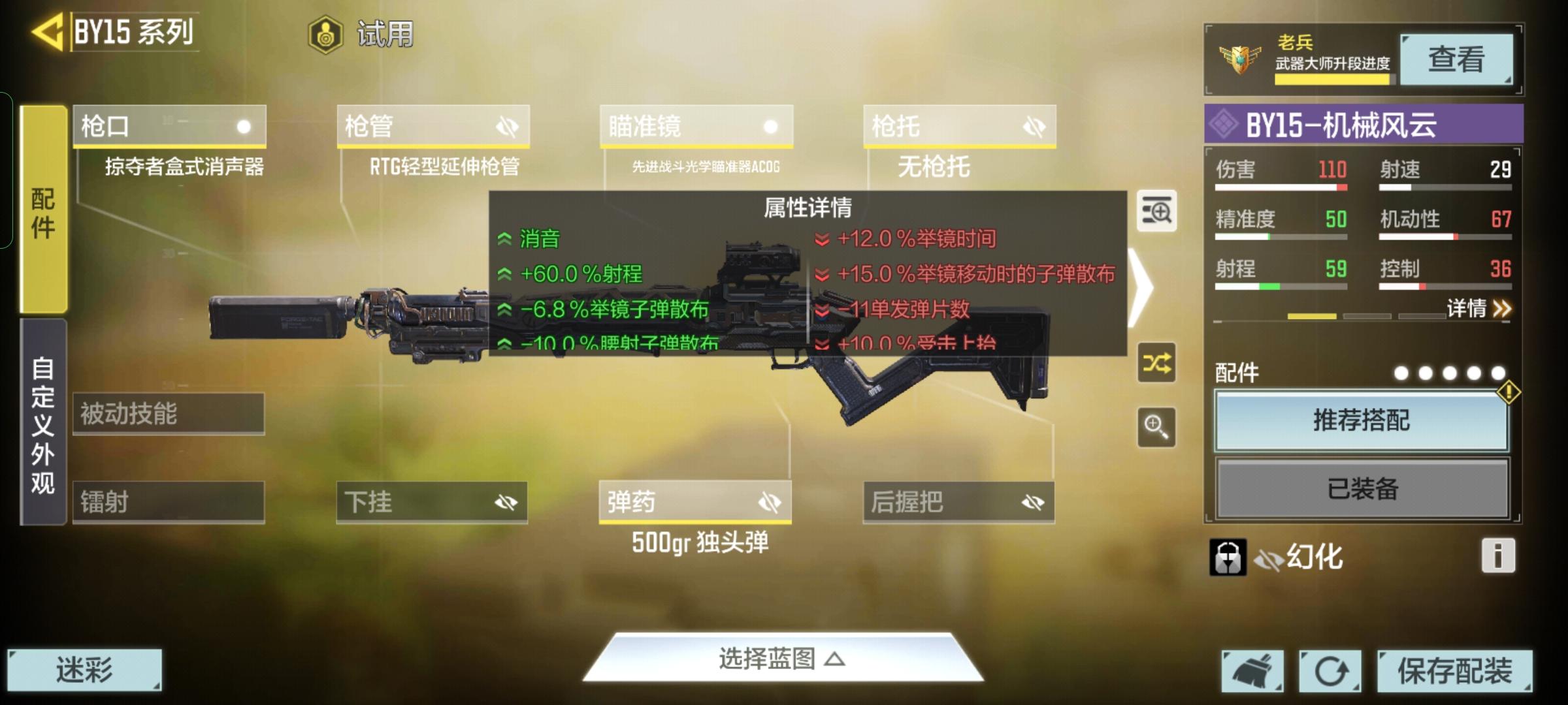 BY15-机械风云核心配件选择500gr 独头弹 和先进战斗光学瞄准器ACOG来将枪械改装成一把单发狙!射程方面选择RTG轻型延伸枪管和掠夺式盒式消声器将射程提高到极限160%的同时,给予消音效果和精准度的提升!最后选择无枪托配件,来最大限度提升枪械机动性!这套配件哪怕Q33、AMR见到都得跑~