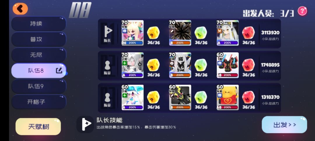 ①落樱队长拉暴击率,除落樱其他角色武器暴击率100%左右,落樱全爆伤。因为十二天赋加成有bug,否则80就够了。