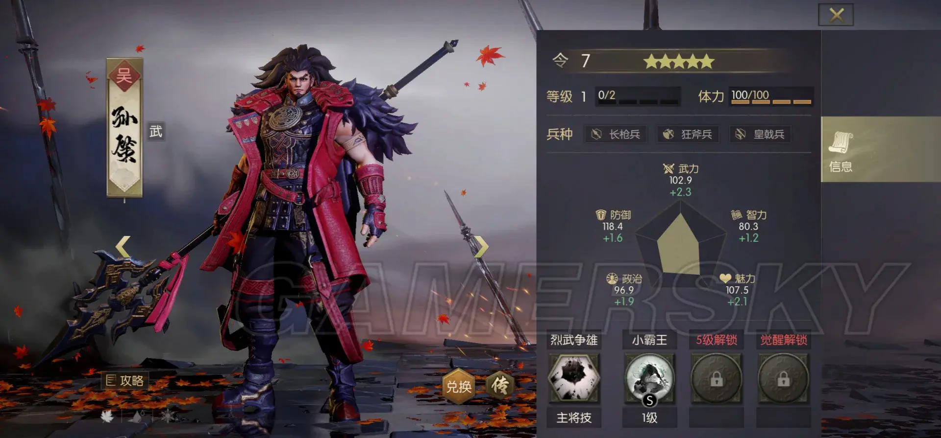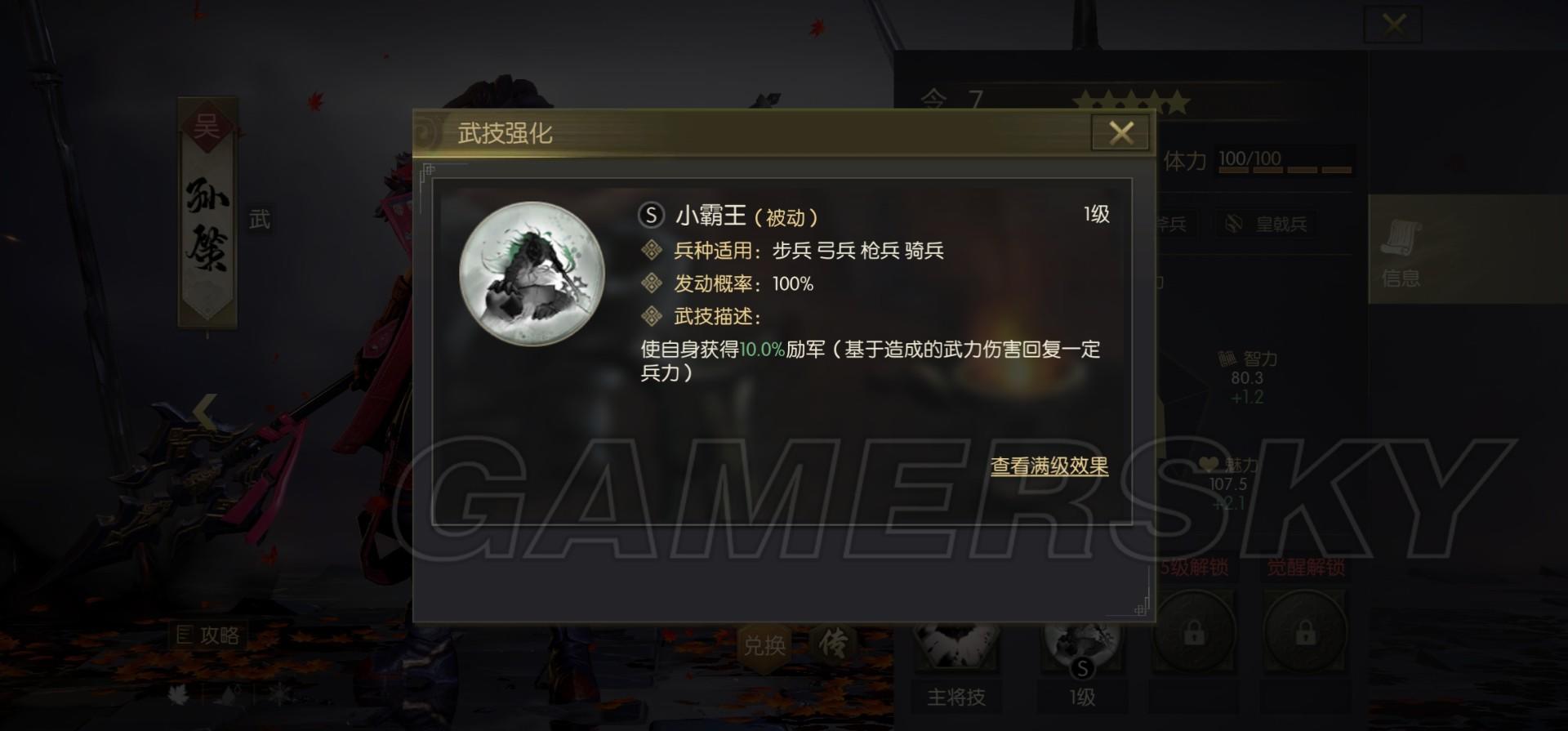 一句话简评:小霸王可以看做满级20%的吸血,强度比较吃战法与阵容搭配,怎么最大程度发挥这20%吸血是孙策最要考虑的事。