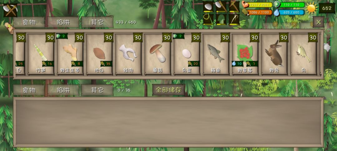 最后刷萝卜前先做好营地规划,至少1个采集食物,一个采集材料的仓库堆满了。