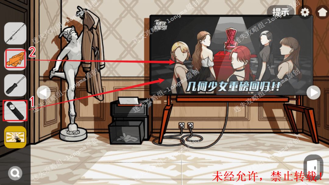 104.左转来到电视机处,对电视使用【遥控器】,盖上【幕布】,记住圆球移动的路线。104 104.1