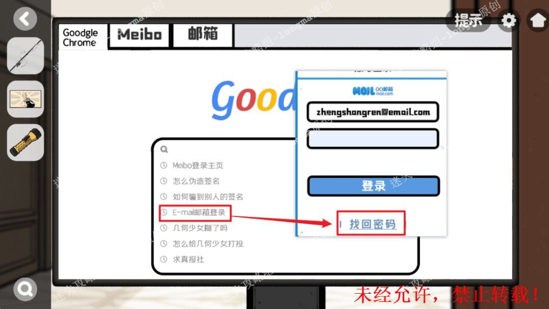 114.返回首页,选择邮箱登录,选择找回密码,输入三个问题:“1998.4.1(照片上的日期)”“1823979020(查看副院长名片+手机短信中后四位)”“几何少女小圆(世界地图右边柜子中)”。114