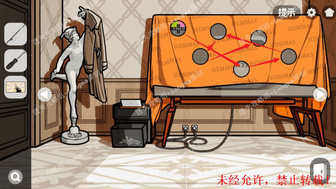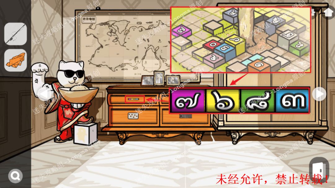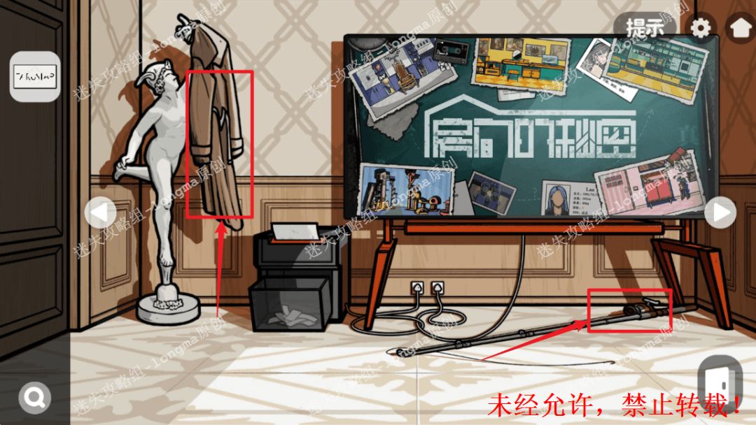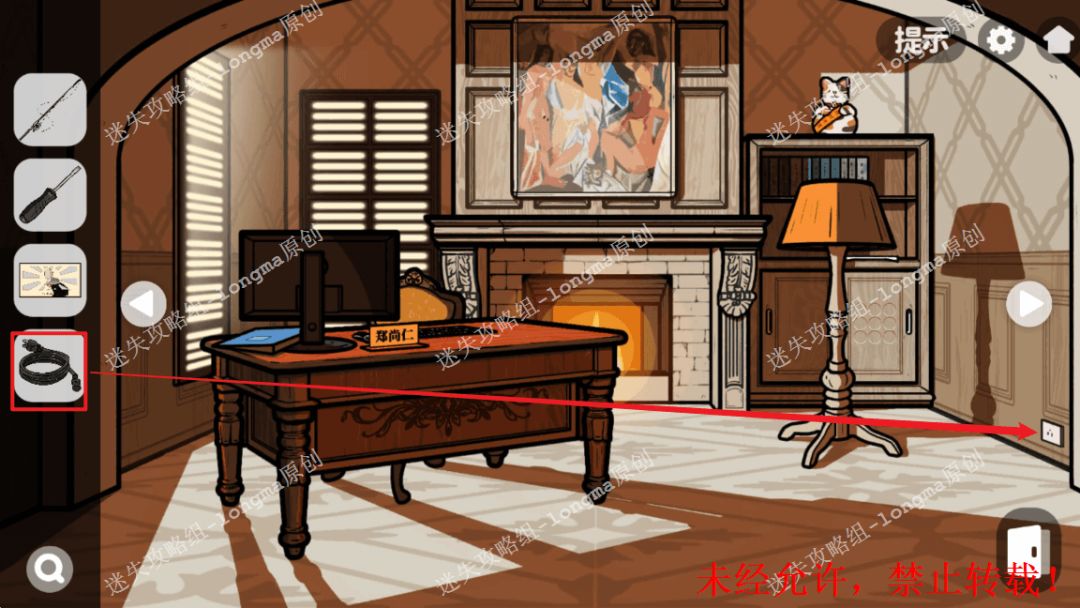 105.返回世界地图处,对照电视屏幕线索,打开桌子左下抽屉,获得【电源线】。105