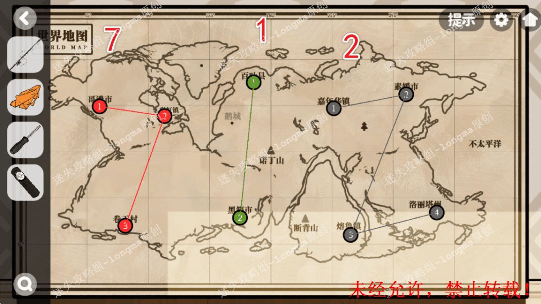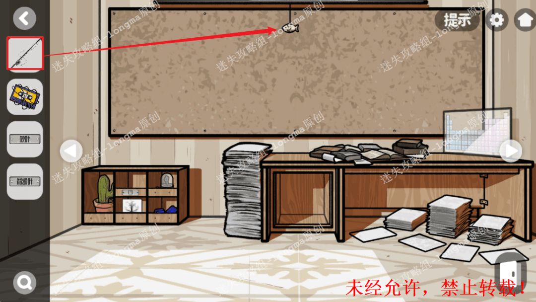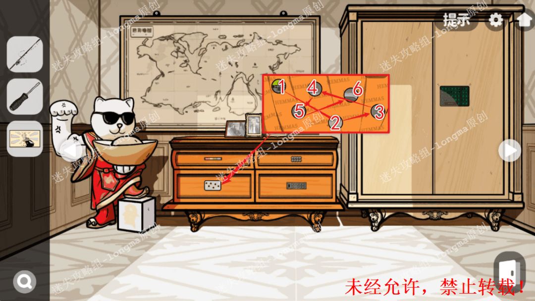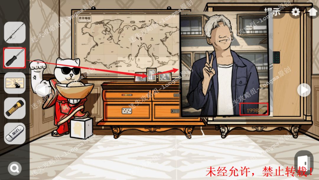 100.右转至世界地图处,对照窗外的图案打开桌子左上角的抽屉,获得【螺丝刀】。100