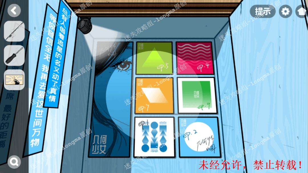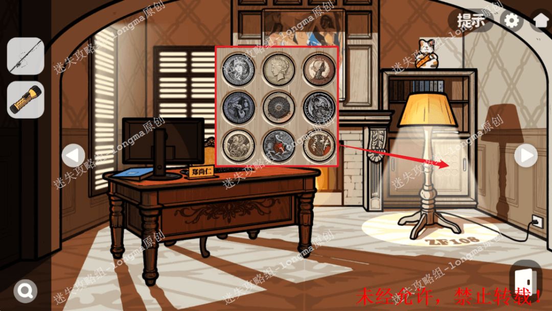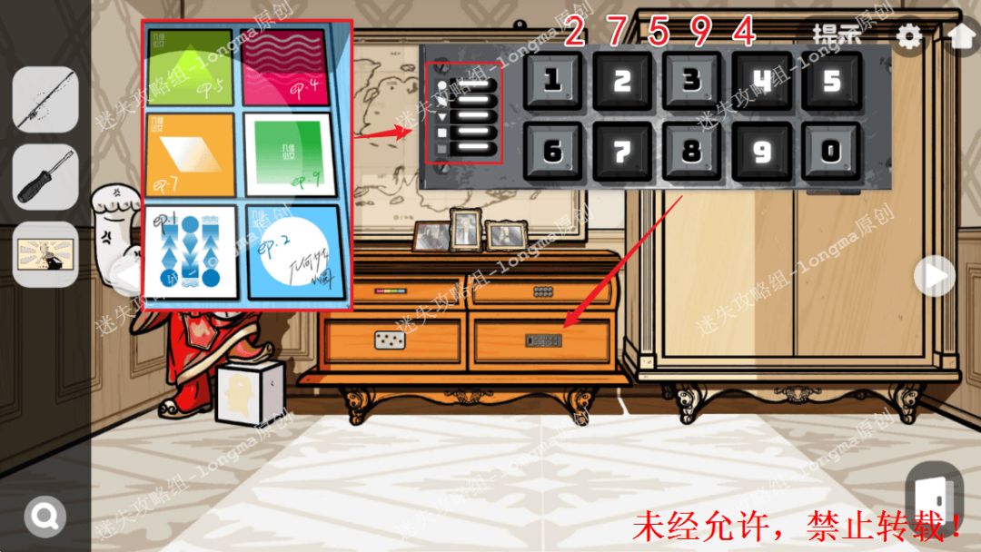 108.根据柜子里的图案,对照桌子右下抽屉锁上的图案,获得密码27594,打开抽屉,获得【手电筒】【网卡】。108
