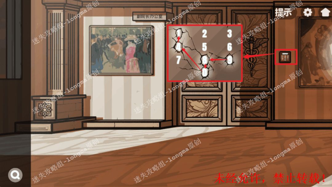 94.查看左边副院长办公室门锁,根据裂纹顺序输入“98041”进入办公室。94