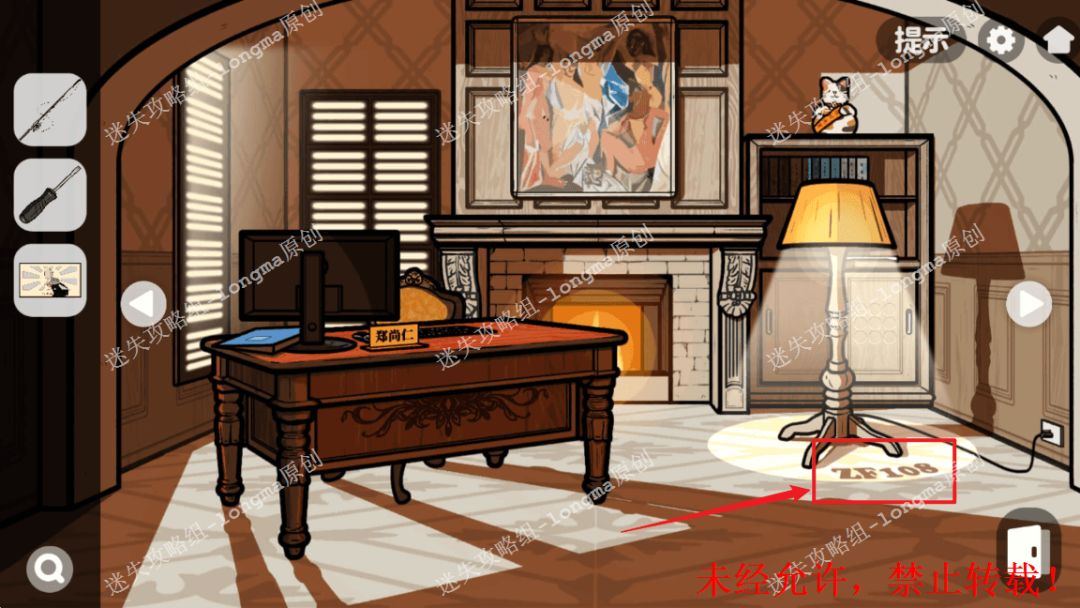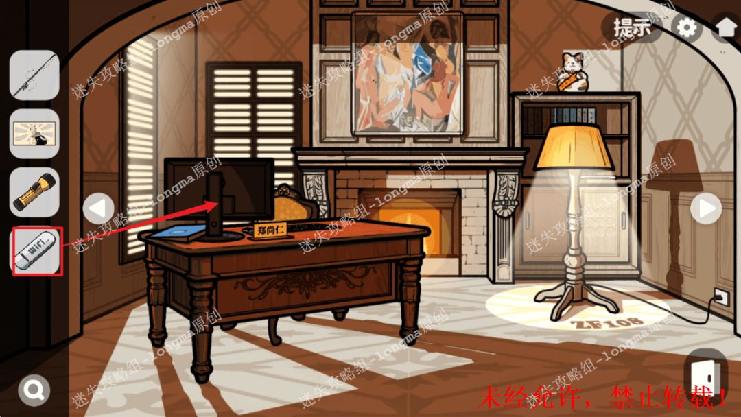 106.右转至办公桌处,对右边墙角的使用【电源线】,并连接台灯,记住下面的字母符号“ZF108”。106 106.1