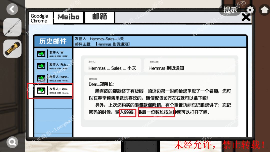 116.对照“Meibo”账号上的图案,打开右边书架下的柜子,输入密码“9999(最后以为长按3s)”获得【受损的磁带】【万能门禁卡】。116 116.1