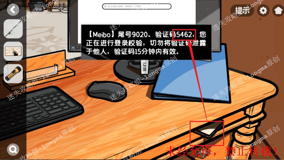112.查看桌子中间的手机,摇晃手机解锁,退出界面,再次查看手机获得验证码“5462”。112